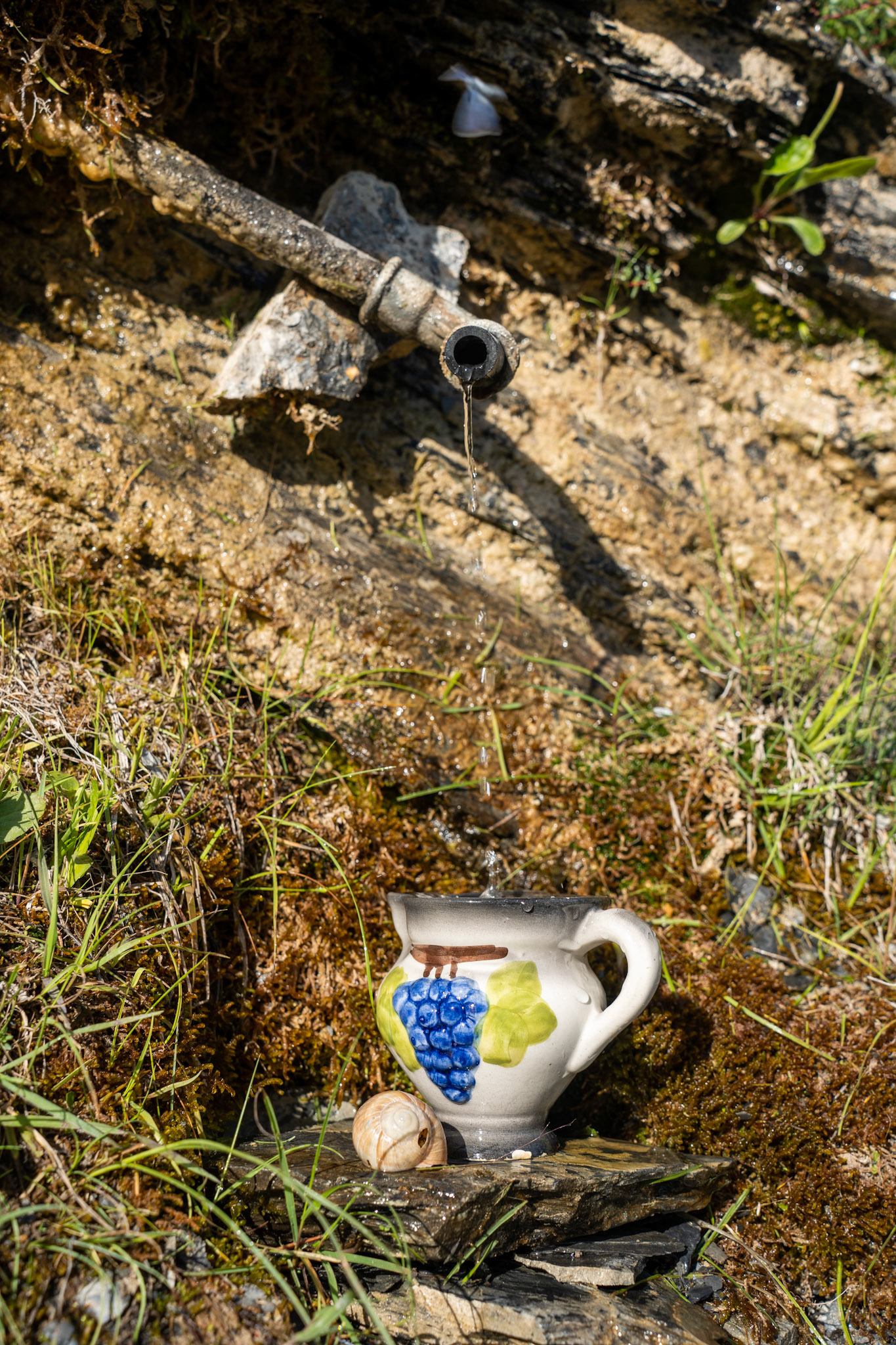 Fresh, drinkable water is available next to the hiking trail in a wine-carafe